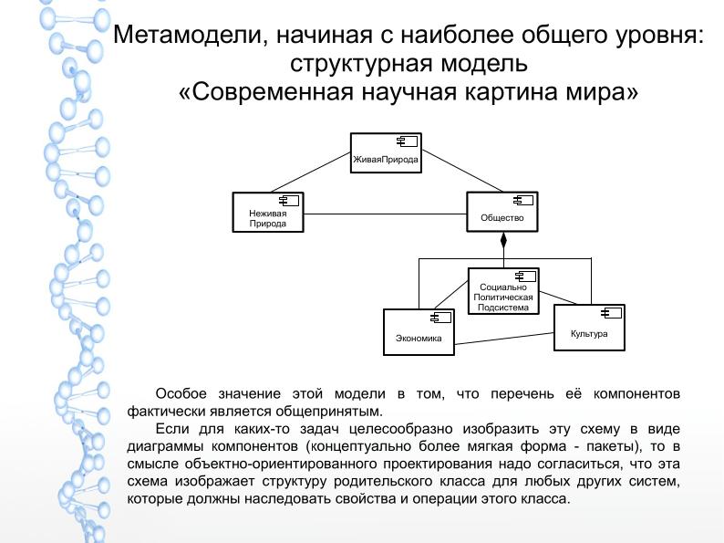 Степень общности и полноты, таким образом, определяет её прикладное значения для разработки различных систем. Если для каких-то задач целесообразно изобразить эту схему как на рисунке 2 в виде компонентов (концептуально более мягкая форма — пакеты), то в смысле объектно-ориентированного проектирования надо согласиться, что эта схема изображает структуру родительского класса для любых других систем, которые так или иначе должны наследовать свойства и операции этого класса. Вне терминологии объектно-ориентированного анализа и программирования то же самое можно сказать так: эта структура в явном или неявном виде должна учитываться при разработке любых теорий (схем, моделей и т.п.).