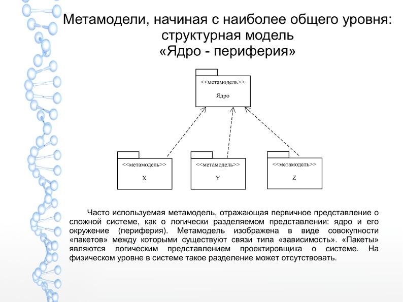 3.3 Распространенной метамоделью является первичное представление о сложной системе, как о логически разделяемом представлении о ядре и его окружении (или периферии). На рисунке 4 эта метамодель изображена в виде совокупности «пакетов» между которыми существуют связи типа «зависимость». «Пакеты» являются логическим представлением проектировщика о системе. На физическом уровне в системе такое разделение может отсутствовать.