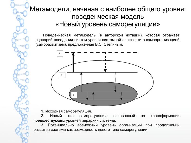 3.4 На рисунке 5 приведена поведенческая метамодель (в авторской нотации), которая отражает сценарий поведения систем уровня системной сложности с самоорганизацией (саморазвитием), предложенная В.С. Стёпиным[2].