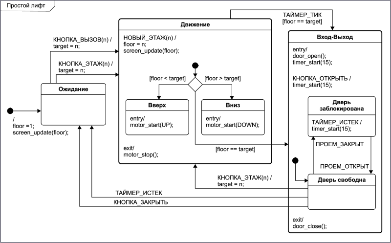 В качестве сквозного инструмента программирования киберфизических систем были выбраны программируемые расширенные иерархические машины состояний (ПРИМС). Этот мета-язык позволяет реализовывать адекватные для умных и встраиваемых систем парадигмы событийного и автоматного программирования[7]. Программный код в виде диаграмм может быть общим планшетом для разработки всей командой — от дизайнеров до программистов, — а на основе диаграммы можно генерировать код для поддерживаемых аппаратно-программных платформ (см. пример на рисунке).