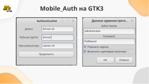 Графический интерфейс, разработанный на Python с использованием PyGObject, в котором пользователь вводит данные о домене, компьютере, рабочей группе, логин и пароль администратора домена. Данные формируются в строку и передаются на системную шину Dbus в метод, который запускает скрипт system-auth с аргументом, строкой, переданной из GUI.