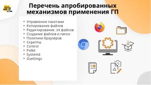 В докладе рассматриваются специфические аспекты применения мобильной ОС семейства «Альт» в доменной инфраструктуре, разработка средств для её управления и настройки. Разрабатывая ОС «ALTMobile», мы начали включать в возможность её конфигурирования применение групповых политик. Задача заключается в организации централизованного управления мобильными устройствами.
